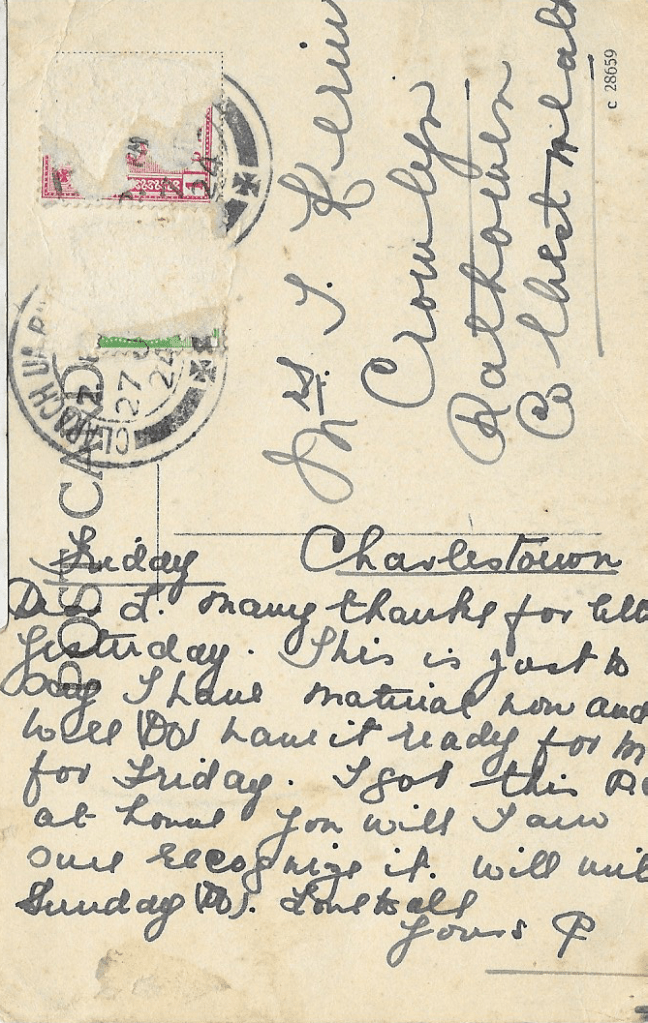 Michael Byrne’s recent blog article ‘The Gill Drapery Store in High Street Tullamore, 1900–22’ reminded me of the significance of drapery stores in the early 20th century and the Clara of my mother’s time. Amongst the correspondence between members of her family, frequent mention is made of the buying of material. The most common form of correspondence would seem to have been the postcard. Below, on the reverse of a postcard that depicted the ruins of Geashill Castle is an example sent on 27th of May? 1924. It was to my grandmother from her sister living in Clara and concerned the buying of material for ‘M’, May, her eldest niece.