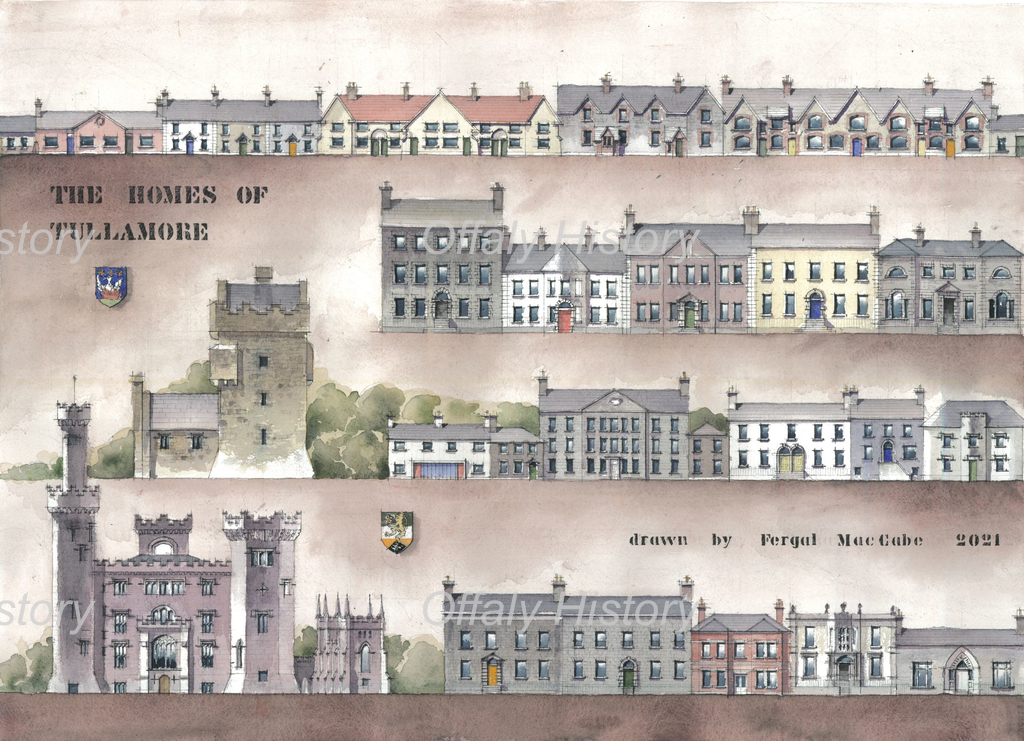 Township could be said to have begun in Tullamore in 1622. On 30 September the anniversary will be marked with an outdoor exhibition of drawings by Fergal MacCabe and a Timeline of Events showing the story of the town since the earliest times. We have covered many stories of Tullamore in over 420 blogs published in this series. All can be accessed on www.offalyhistory.com. For a quick link to all these resources see @offalyhistory