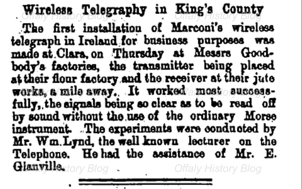 Recognising that most of the capital backing would come from his relatives and Irish milling contacts, Jameson Davis arranged for Marconi to come to Ireland to meet potential investors and to conduct further experiments. The first of these took place in Clara in May 1898, when a transmitter was placed in the mill office at Charlestown and the receiver in the jute works at Clashawaun. The operation was conducted by William Lynd, assisted by Edwin Glanville, who recorded in the visitor’s book for Charlestown House, where he stayed for three days, that he was ‘in charge of the Wireless Telegraph Company’s instruments’. William Lynd, who also stayed at the house as a guest of Robert Goodbody, wrote that he lectured on Marconi’s invention at Clara and Tullamore and then carried out experiments between the flour mill and the jute works. He added that the demonstration was a ‘perfect success, first in Ireland’. Robert was very much involved in the proceedings and sometime afterwards was presented with a silver replica of the transmitter by Marconi. It is not thought that Marconi himself was present on this occasion. William Lynd was a London scientist, who had visited Clara the preceding January to give a lecture at the Institute on x-rays, ‘with practical demonstration’. He came again in 1901 to lecture on ‘Bacteria’.[1]