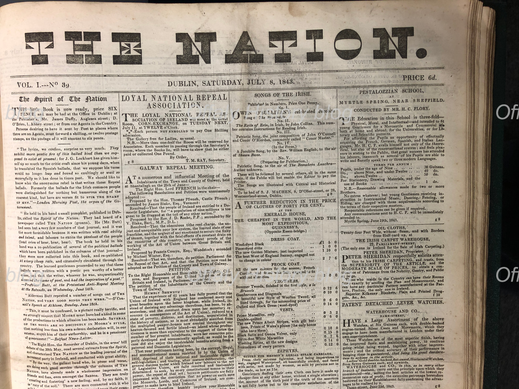 His favoured style of poetry seems to have been lengthy narrative pieces. His earliest publication was the nearly 2,000-line poem ‘Eva O’Connor’, published in 1826 when he was just 22 years old. His conversion to nationalism, evidenced by his support of O’Connell’s Repeal Movement, and Davis’s Young Ireland, moved him to devote his poetic talents to shorter pieces articulating the aspirations of those movements, and giving voice to the sense of grievance commonly felt by Irish people at the time considering the many different ways that Ireland was exploited and mis-governed by the Westminster Government. These political pieces appeared in the nationalist press, in periodicals such as The Nation, The Freeman’s Journal, and several others, and were anthologised in 1845 in Poems for the People, in the introduction to which Frazer frankly acknowledged the political tenor of the collection, and indicated that he hoped it would have a politicising effect on Irish people.