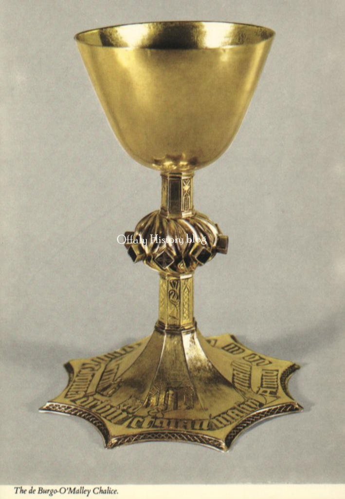The De Burgho [sic] chalice was found in Tullamore in the nineties of the last century. There is no one now who can tell how it came to Tullamore, or how long it lay in an old worm-eaten box with a set of vestments and an old missal. God alone knows how they survived the rapine and destruction of the Penal times, or by what hunted priest or prelate they were used. The old box was found in the rather spacious house at the corner of High Street and O’Moore Street, the owner and occupier of which at the time was a celebrated solicitor, Mr. Darcy Dowling, better known to fame in local parlance as “Torney Dowlin”. The house is now occupied by Mr. Albert Roberts and portion of it is let in flats. It was, for nearly half a century, the Presbyterian Manse. After Mr. Dowling’s death. The eminent, and still virile legal firm of Hoey and Denning, took over and established their office where “Torney Dowlin” had so presided. They subsequently moved to their present splendid offices in Bridge Street. The Dowlings were related to the Galway Blakes, and it is presumed that the box and its contents came to Tullamore through, and from the Blakes. At all events, D’Arcy Dowling or his son, Tony Dowling, who is still remembered by old natives of the town like Mr. John Lloyd, Mr. Hugh Digan, Mr. Patrick Power and Mr. Frank Reynolds, and others, gave the chalice to the late Father Hugh Behan, P.P., V.F. Father Behan, who died by the way very suddenly on 25th May, 1899, sent the chalice to Messrs. Smyth, the well-known Wicklow Street firm of church plate manufacturers, in March 1897. They at once recognised it as a most valuable antique, and they replied, giving their expert opinion to Fr. Behan. They expertly explained that any repairs or renovations would, in the circumstances, be merely harmful and they advised against such a course, they returned the chalice to Father Behan. And he in turn promptly returned it to Mr. Dowling. Sometime later an English nobleman-Lord Swaythling-bought it at Christie’s auction rooms in London for more than a thousand pounds. It was subsequently bought for the National Museum, where, as already stated, it now reposes.[3]