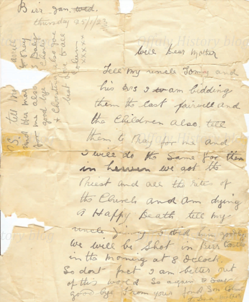 [1] Ronan McGreevy, Irish Times, 26 Jan. 2020; Philip McConway, ‘Offaly and the Civil War executions’, Tullamore Tribune, 25 December 2017; Philip McConway, ‘Offaly and the Civil War’, Offaly Heritage 5 (Tullamore, 2008), pp 251–74; Maurice Egan, ‘What If? 1919-1923: Columb Kelly, executed at Birr during the Civil War. By Maurice G. Egan in https://wordpress.com/post/offalyhistoryblog.wordpress.com/8910. Michael Keane, ‘Dependency claims for the Civil War executed in the Military Service (1916–1923) ‘in Pensions Collection, History Ireland, Revolutionary Period 1912-23, Volume 26; Lisa Shortall, ‘Sources for the study of the revolutionary period in King’s County/Offaly (1912-1923)’ in Offaly Heritage 9, (2016) pp 281–319.