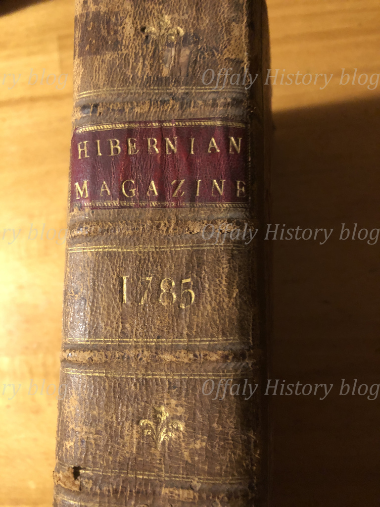 Offaly History recently acquired a copy of the 1785 volume of the Hibernian Magazine to place in Offaly Archives because of its published report of the famous fire. The Hibernian Magazine was printed over the period 1771–1812. The first of the monthly issues of 1785 contains a report of the first successful manned flight of an air balloon in Ireland – that of Richard Crosbie – who had married an Offaly woman, Margaret Armstrong in 1780. She was said to be a daughter of Archibald Armstrong and possibly from the Ballycumber district (see Bryan MacMahon, Ascend or die, History Press, 2010) The May issue of the Hibernian has the report from Tullamore; also an account of an explosion in the powder room at Cloghan, King’s County barracks (gun powder that is) and the report of Richard McGwire’s ascent via balloon over the Irish sea and later rescue. McGwire stepped in for Crosbie and received a knighthood for his pluck and bravery. As a young Trinity student he probably knew Charles William Bury, the owner of Tullamore and who came of age in June of that spectacular year. The Hibernian is indeed a primary source for Irish history and good to have this important book in the Offaly Archives collection for its first-hand account of ballooning in Ireland and its consequences for Tullamore.