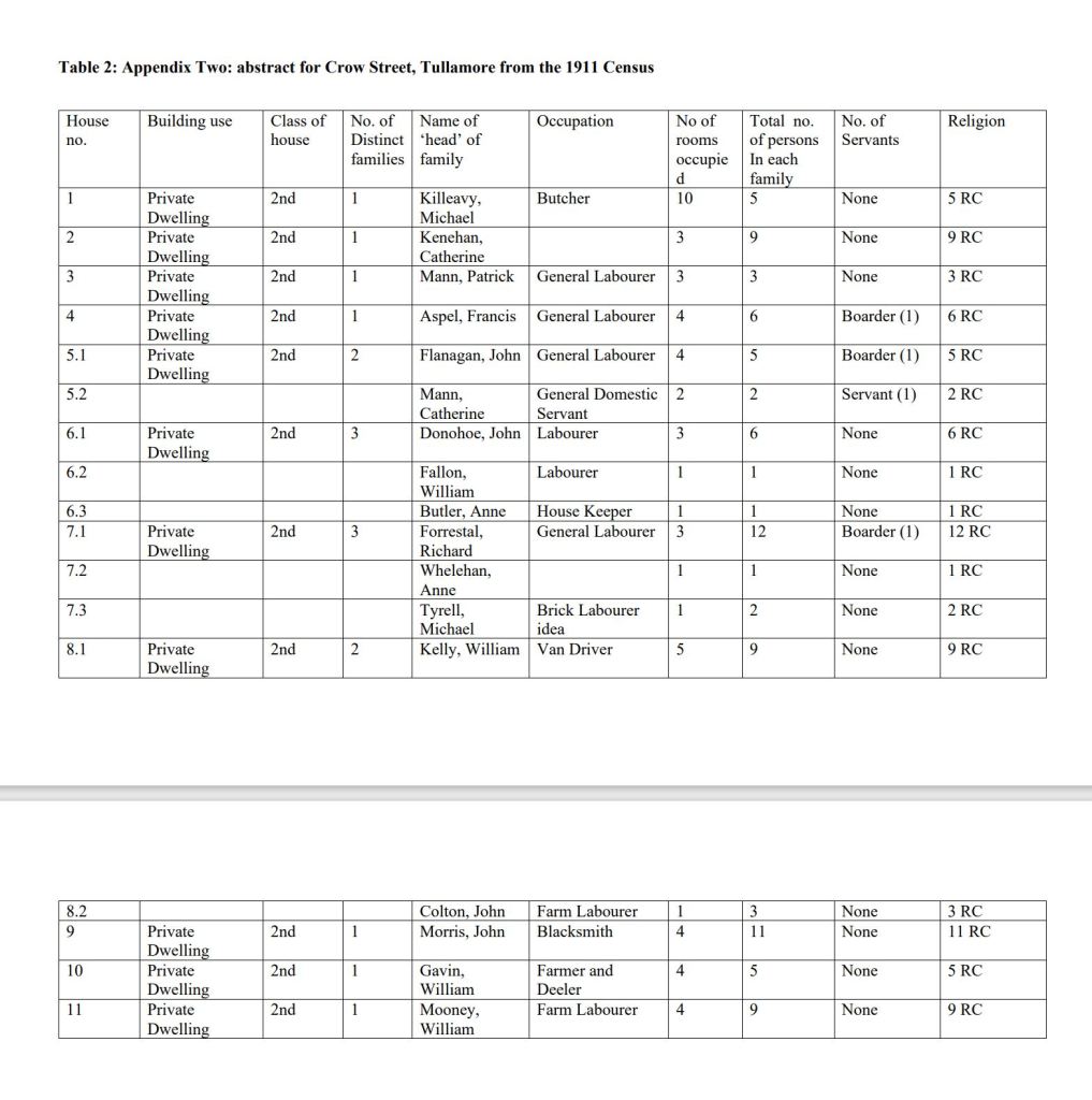 In 1911 Crow Street had ninety people with seventeen families and eleven inhabited houses. All were Roman Catholic. One house had three families and fifteen people, another two families of twelve people. Three families with a house each had between eleven and nine in the family. The circumstances of some of the same families had deteriorated with one family of twelve now in three rooms and another with eleven in four rooms. Families, even when crowded, might have an in-law or boarder living with them.