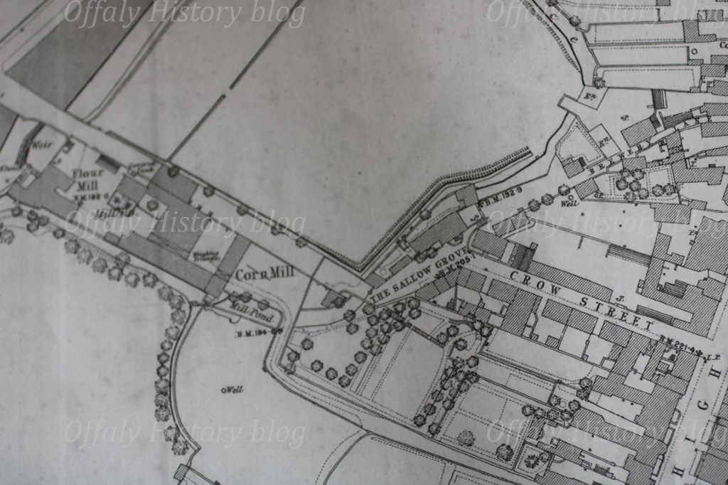 Crow’s long lease to Andrew Joseph O’Flanagan of the large plot called GV 27a and 28 High Street (on the Griffith valuation map of 1854) facilitated the development of the flour mill and the corn mill on the river at the western end of Crow Street in what came to be known as the Sallow or Sally Grove. The mill had its access via the gateway at 27a (formerly Marron’s) on High Street. As can be seen on the 1838 map this led down to a flour mill and a corn mill. The Crow Street Sally Grove roads let on to the Crow gazebo and the road to Daniel Jackson’s house. The vacant site to the south of these houses and adjoining Acres Hall was used for the new Presbyterian church in 1865. Two of the three houses at the junction of High Street with Crow Street, and erected early in the eighteenth century, were demolished to provide for a wider access to Tara Street and the new Bridge Centre opened in 1995.