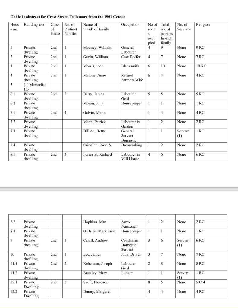 In 1901 the street had eighty-five occupants, eleven houses and nineteen families. Of that number eighty were Roman Catholic and five, in one family, Church of Ireland. The houses were all of stone walls and slated and were placed in the secondclass. The out housing included one coach house, three stables, one cow house, three piggeries, and one fowl house and a turf house. One house had four families, another three and two houses had two families each. The house with four families was comprised of four rooms for nine persons. The street was inclusive of the non-residential old Methodist church which was by 1901 a trades union hall.