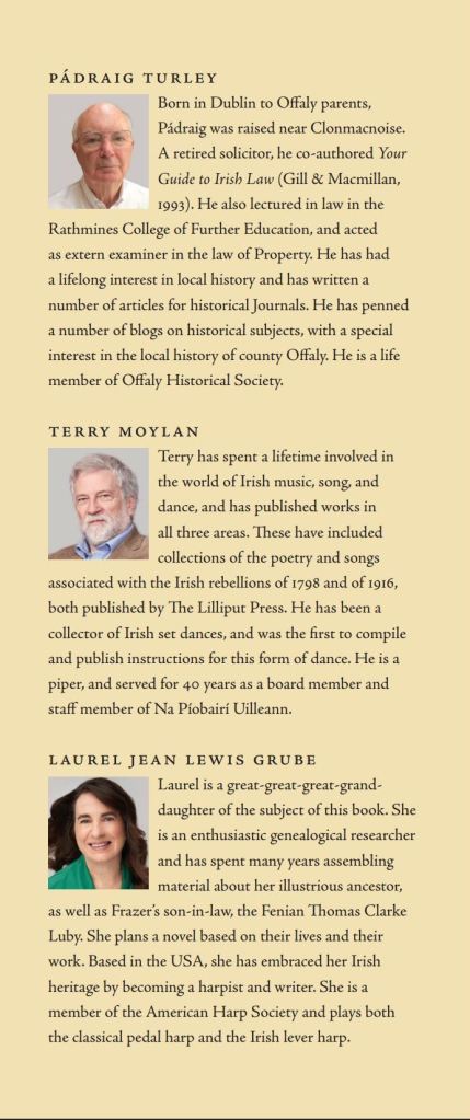 At the launch, I played a small, borrowed harp for Frazer’s poem “The Harvest Pledge” which was set to music. The melody was composed by the well-known Frank Callery. Nancy Gillan, my harpist friend, composed the baseline. I felt honored sitting there playing the poignant music as Terry Moylan read the poem with skill and emotion. Later Frank Callery beautifully sang Frazer’s poem, “Clondallagh”, which he had also put to music. Tears welled up in my eyes as I imagined my ancestor listening down from above, pleased with Frank’s understanding of his words with the perfect notes to express them.