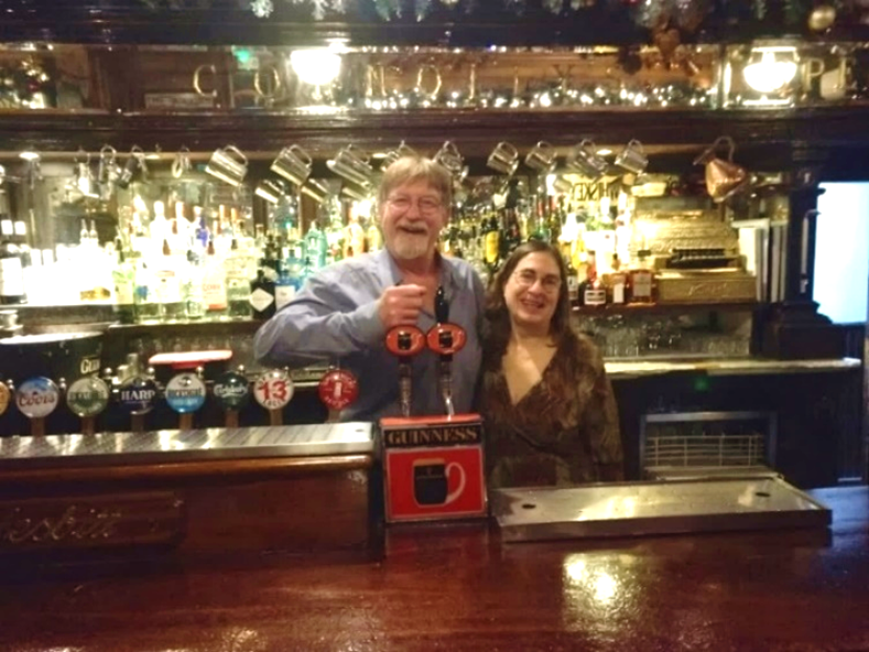 On our last night in Ireland, we had dinner with our friends. Afterward, we went to O’Donoghue’s Pub where PJ sometimes plays. He was not there but Frank Nugent was, a friend of Terry’s and Padraig’s. The pub was crowded so we went to another famous old pub, Doheny & Nesbitt Public House. There we learned Frank was a mountaineer and deputy leader of the first Irish ascent of Mt. Everest in 1993. We enjoyed an evening of friendship, song, and laughter. Before leaving there the pub’s bartender had Lou and I stand behind the original 1867 bar and took our picture as Lou pulled the tap for Guinness Beer.