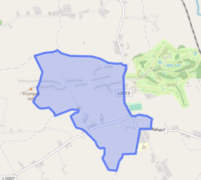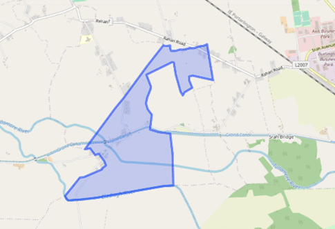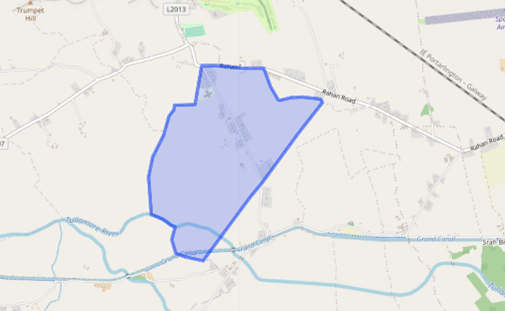 On the Grand Canal, ½ mile west of Srah Bridge, and bordering the parish of Lynally. Contains 82a. 2r. 32p. Is all arable and pasture, but the south part is subject to floods.