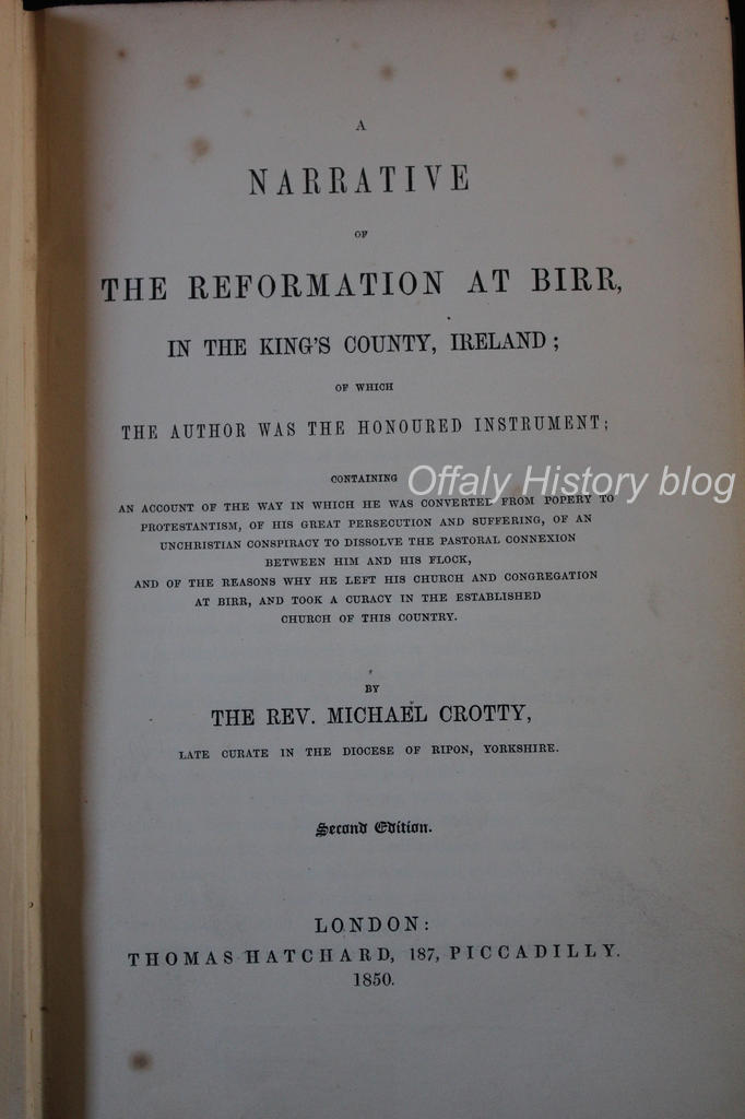 A uniquely bitter schism occurred in Birr, County Offaly (Parsonstown, King’s County) when two cousins — both Catholic priests — converted to Protestantism, taking relatively large numbers of parishioners with them. Revs Michael Crotty (1794/5–1862) and William Crotty (1808–56) amplified a local disagreement with their bishop, concerning the construction of a new Catholic chapel — aided initially by the rising Catholic lawyer Thomas Lalor Cooke (1792–1869) — to sow seeds of discord, riot and, ultimately, schism, to drive a wedge within the local Catholic community, leading ultimately to the Crottys and an estimated 900 supporters adopting an increasingly Protestant theological outlook and taking over control of the recently-completed chapel. Crucially, they also preached to their flock in English and distributed hundreds of copies of the Bible, practices viewed with suspicion by the Catholic Church and associated with Protestant missionaries.