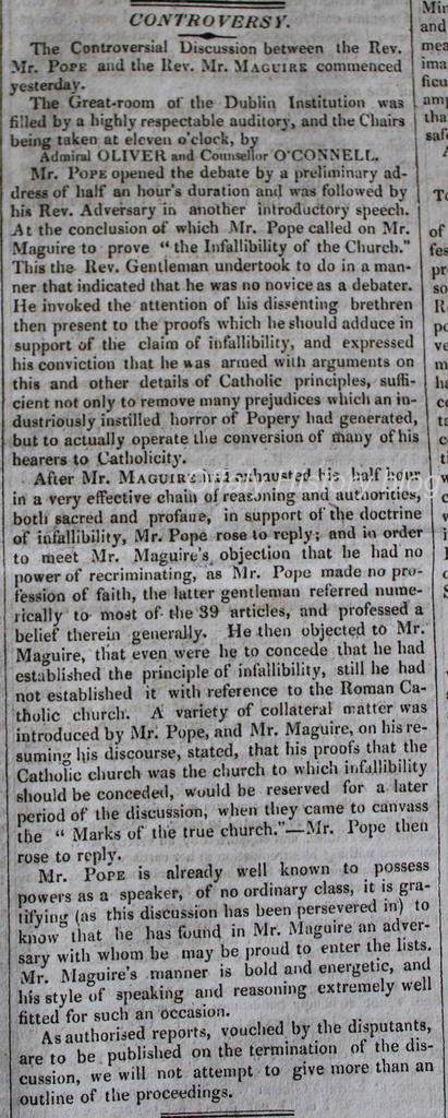 The ‘bible war’ which formed such an important part of the ‘Second Reformation’ saw the emergence of a ‘new spectator sport, in the form of public religious controversy’ (SJ Connolly in Vaughan (ed.), New history of Ireland, v, p. 78). The most notorious debate was that between the Church of Ireland clergyman Rev. Richard Pope and the Catholic priest Fr Thomas Maguire, who debated over six days in Dublin in 1827. The deep-seated hatred and suspicion between Catholics and Protestants were inflamed by an intemperate pamphlet literature. Missionary efforts among evangelical wings of the main Protestant churches and religious societies, already under way since the 1790s, were emboldened and well resourced, and were manifest in the first attempts in over a century to undertake the mass conversion of Irish Catholics.