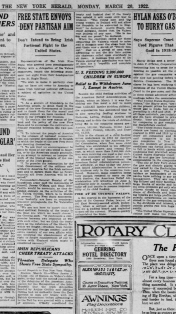 Sean and his colleagues quickly issued a statement explaining their status and mission, emphasising that their instructions from Collins and his government were: firstly to acknowledge and to thank Irish America for its crucial support in the long struggle for Irish freedom; secondly to explain the reasoning and intention behind the decision taken by the Dáil majority to accept and work within the terms of the Treaty, subject to the outcome of the planned election in the Summer and last, but by no means least, to explain the Provisional government’s intentions regarding the repayment of the American bonds (worth in the region of $5 million) which had been so crucial to developing the ‘State within a State’ during the preceding years after the creation of the Dáil. However, this statement of intent was somewhat overshadowed at the start of the Mission by press reports of what was termed Irish faction fighting and division.