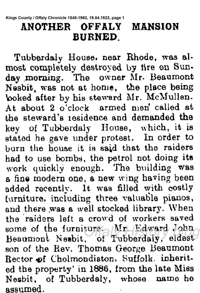 Terence Dooley in his Burning the Big House: the story of the Irish country house in a time of War and Revolution (Yale, 2022) devoted fourteen pages to a case study of the burning of Tubberdaly, Rhode. He concluded that the house was burned as a result of labour disputes, local agrarian issues and the demand to have the demesne and untenanted lands distributed to local people as the main reasons.[1]
