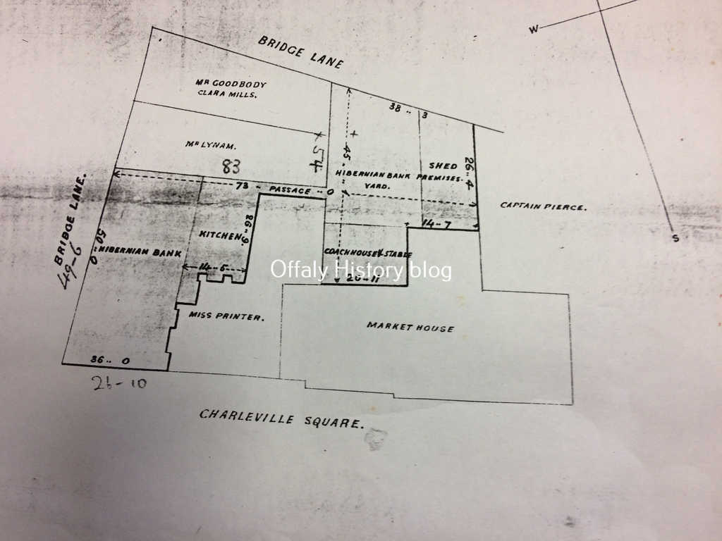 The original title is a lease of March 1786 from Charles William Bury to Francis Ridley of ‘the plot of ground adjoining Margaret Ridley’s house [12 O’Connor Square] to the corner of High Street [Bridge Street] twenty six feet, ten inches and in front to High Street [Bridge Street] forty nine feet, six inches and in the whole three perches’ for three lives with perpetual renewal at a yearly rent of £2 and £1 renewal fine.[4] A house was erected on this site which Francis Ridley sold to James Ryan in 1796.[5] Richard Ryan, grocer and spirit dealer, was in possession in 1843. The surveyor remarked that it was ‘an excellent situation for business’.[6] Mrs. Mary Ryan occupied the building in 1854 and she leased it to the Hibernian Bank in 1864 for sixty years at a yearly rent of £45 and then described as a dwelling house and premises together with a small house adjoining same but now forming one premises.[7] A certain Francis Ridley, shopkeeper of Tullamore, who died in 1862 gave his interest in his O’Connor Square -Bridge Street house to his niece, Mary Ryan, widow of the late Richard Ryan ‘all my interest in the house in which she at present resides’ with the remainder of his property to another niece, Mary Prenter. Mary Ryan, now of Belfast, in her will of 1896 (she died in 1902) left her interest in the bank property at Tullamore to her son James Francis Ryan. The rest she divided equally between her sons James Francis, Richard and her daughter Arabella Charles.