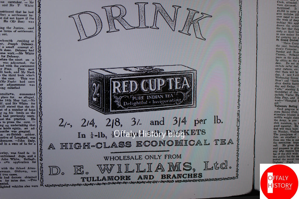 A visit by an Irish Press journalist to Tullamore in 1933 provided a nice puff for the Williams tea business and its brand Red Cup Tea. At the time Williams provided regular advertising in the Irish Press for its tea and Edmund Williams (d. 1948) was a founder director of Irish Press. D.E. Williams’ interest in tea can be traced back to 1895. In the Chronicle and the rest of the local press for February 1895 advertisements appeared in connection with the opening of a wholesale tea business by Daniel E. Williams. In a comment the Chronicle stated that most of the blending was done in London where D.E.W. had larger stores than hitherto. The draft 1917 accounts for DEW Ltd show sales at £8,324. This had risen to £13,807 by 1923. The business was much expanded in the 1930s led by the blender, a Mr O’Shea.