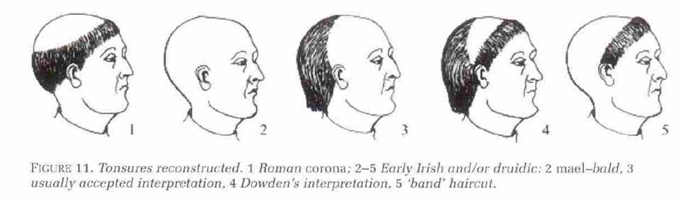 The earliest Christian tonsure, practiced probably from the fourth century, consisted of shaving the entire head. The Roman tonsure appears in the 6th century and consisted in shaving the top of the head, leaving a circular band of hair in the form of a crown. By the 7th century the Roman tonsure had come into conflict with the Irish style. It is suggestion that the Irish tonsure was from ear to ear and although rejected at Whitby but survived for some time.