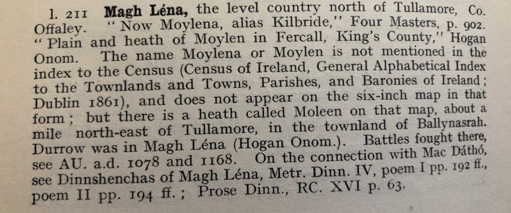 According to the Triads of Ireland the Bishop of Emly headed the list of clerics gathered at the Synod of Mag Léna. Cummian lists the principal participants at the synod as ‘the successors of our first fathers: Bishop Ailbe of Emly, Ciarán of Clonmacnoise, Brendan of Clonfert, Nessan of Mungret and Lugid of Clonfert-Mulloe’. Cummian was abbot of Durrow and regarded as a fer légind (head master/academic). There is no record of any of the local princes attending the synod.
