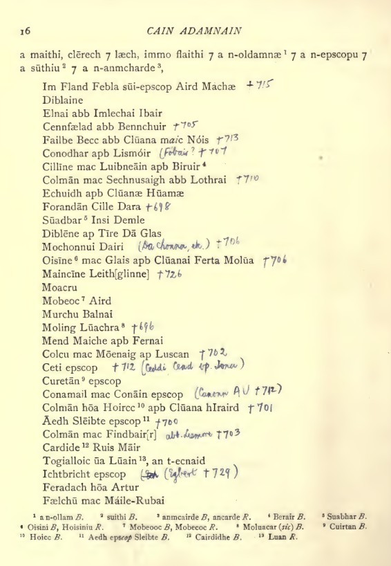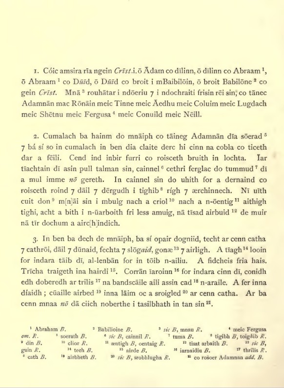 In 1905 Kuno Meyer published his Cáin Adomnáin from the two surviving manuscripts, from the Bodleian Library, Oxford and the Bibliotheque Royale, Brussels. Here are his published page 1 from the Cáin.