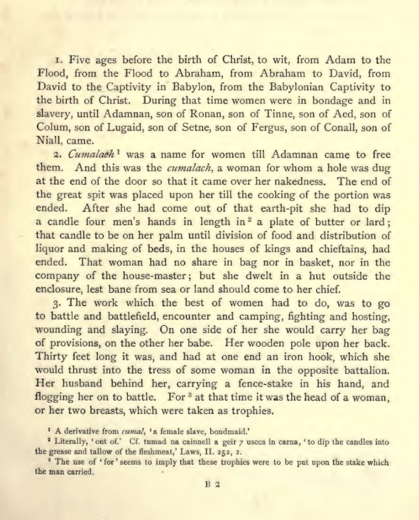 In paragraph 3 Adomnán decries the role of women in war ‘this was the work which the best women had to do, was to go to battle and battlefield, encounter and camping, fighting and hosting, wounding and slaying … her husband behind her, carrying a fence-stake in his hand, and flogging her on to battle’.