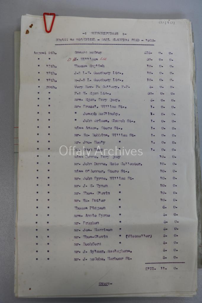The papers in Offaly Archives were retained by Henry Brenan of Hoey & Denning Solicitors, Tulllamore, the election agent for Cumann na nGaedheal. For more on Brenan as crown solicitor 1916–20 see an Offaly History blog of 2016 in this series and Legal Offaly (2008).[6] Brenan was agent for E.J. Graham of Tullamore in the December 1914 by-election which had been hotly contested with Adams losing by 79 votes.[7] Being the good solicitor he was Brenan wrote on 13 August 1923 to James Murnaghan (1881–1973) then a junior barrister (admitted 1903) who practiced on the Northern and Midland Circuits and was a part-time law professor in UCD. He was appointed to the High Court bench from the junior bar in 1924 and to the Supreme Court in 1925.[8] Brenan was concerned about the conveyance of voters to the polls in hired vehicles and, of course, that such expenses could be properly defrayed by the election agent (see image attached). The total expense of the 1923 general election, as paid by Brenan as election agent, was £691 of which bill posting was £89 and printing and advertising £213. Of course there was a shortfall in funds with Central Office of Cumann na nGaedheal leaving it to the local organization to find the shortfall. A list of the subscribers to the funds in August has survived (see image).