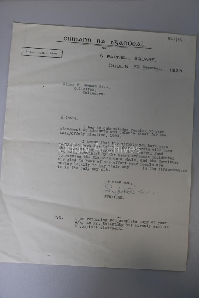 The purpose of this article is to look at some of the Cumann na nGaedheal party papers in Offaly Archives which throw a little light on the state of the organization in Laois-Offaly. To recall that the party was founded in April 1923. The new party was comprised of those members of Sinn Féin who supported the Treaty as a compromise and ‘a stepping stone’. After the death of Michael Collins the party moved to centre-right under the leadership of W.T. Cosgrave and Kevin O’Higgins. Little has been said about O’Higgins in recent times but it should be recalled that he campaigned for Parick McCartan in the 1918 by-election in North Offaly and for a ‘seditious speech’ at Garryhinch crossroads was sentenced to three months in prison. O’Higgins was a TD for Laois and Laois-Offaly for the years 1918–22 but moved to a Dublin constituency for the for the 1923 general election, and in the aftermath of his father’s murder in the course of the civil war.[5]