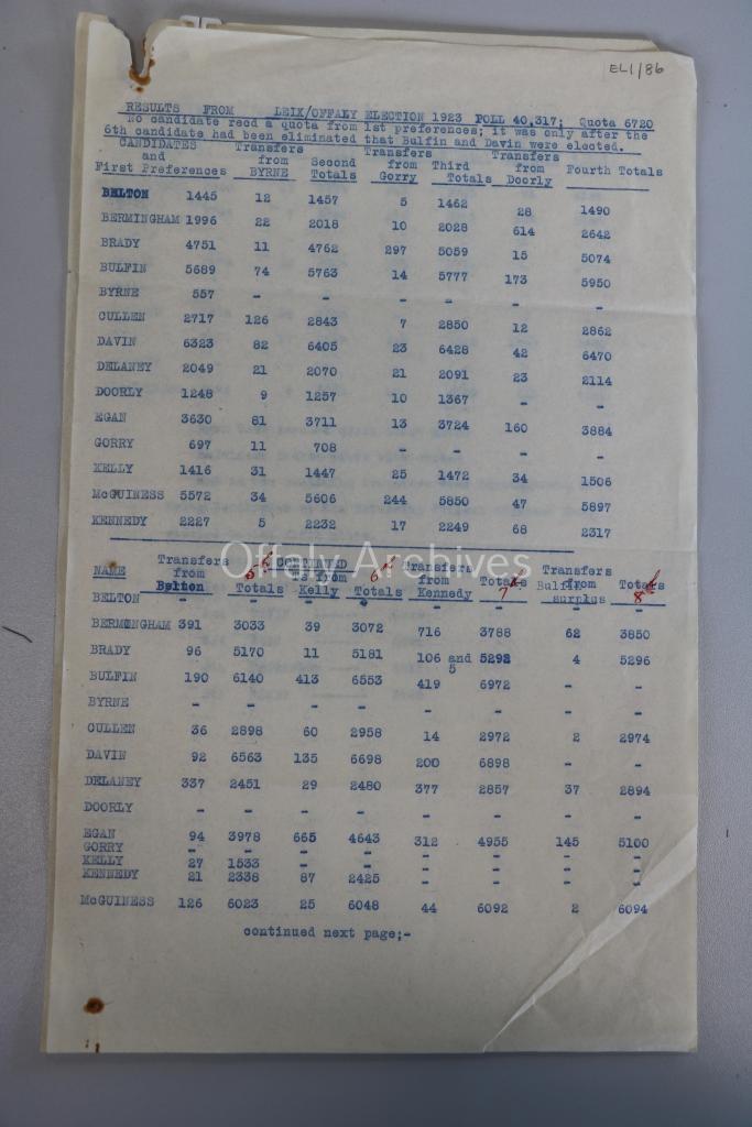 To recall the voting for the fourteen candidates see the last blog and the table from Offaly Archives shows the transfers and confirms what Egan had to say in his speech of thanks in Tullamore in September 2023. Perhaps the workers in the firms of Egan and Williams were only prepared to give a second preference after they voted Labour.
