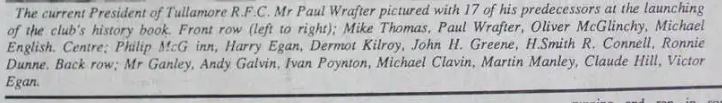 The Club will celebrate its centenary year in 2037. Affiliation to the IRFU came in 1937 with the revival and the founding of the second club. The new Offaly Heritage 12 has an article on Association Football in Tullamore and a piece on the Sterling family. Very soon we will run articles on Tullamore’s first gym and on early golf in Offaly.