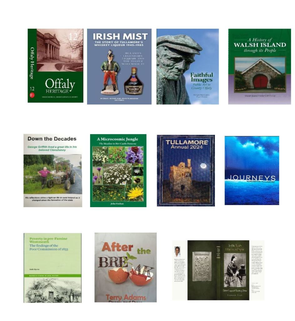 The publications below are available from Offaly History’s history shop at Bury Quay, Tullamore beside the Old Warehouse restaurant, online 24/7, and open Mon to Fri 9 to 4. 30. We are also in Bridge Centre from 14th to 24 Dec. as in previous years. We look forward to seeing you. All our work is to promote Offaly History on a selfless basis. All the publications below are from authors pro bono, pro deo, pro condado.