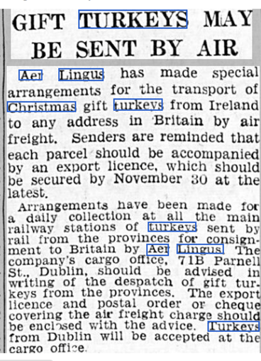 However, it seemed there was a change of heart by the British Government by the end of 1948. Increasing numbers of emigrants were returning home to Ireland for Christmas by air rather than sea. This situation presented a problem to Aer Lingus. There were more passengers returning from Ireland than those leaving. A financial means of correcting this imbalance was needed. The solution was found by transporting ‘gift turkeys’ by air. They began offering a service by which turkeys sent by Irish families were flown to Britain during the week before Christmas via special Aer Lingus cargo flights. A notice in the Irish Independent of 24th November 1948 explains how the delivery was organised. Such deliveries were met with great excitement in Britain.