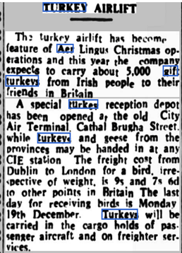 The ‘gift turkey’ scheme by air can be seen to have continued for a number of years as illustrated in The Wicklow People of 17th December 1960.