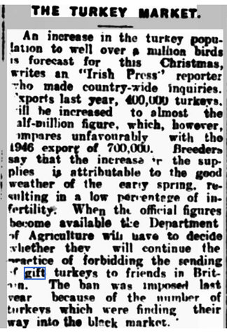 During the twentieth century a tradition arose of a Christmas bird, usually a turkey, being sent from Ireland to extended members of the family who had emigrated to the Britain. They arrived in a canvas bag packed in straw. The Second World War disrupted the tradition. It did not resume immediately after the War as the British Government thought that birds would be traded on the black market in contravention of food rationing as explained by the New Ross Standard 22nd October 22nd 1948.