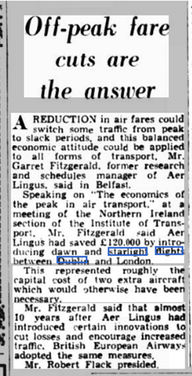 It was at the end of the 1960s that Aer Lingus introduced off – peak fares. By then my grandmother was living with one daughter in Malahide near Dublin Airport and two other daughters, my mother and aunt, were living near London Heathrow Airport. The Belfast Chronicle of 18th December 1959 explains the new services.