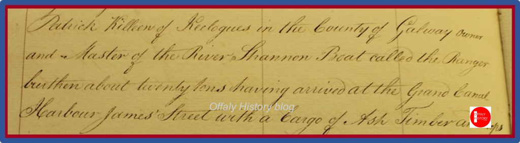 A note from the Grand Canal Company’s minute books recorded the inaugural trip made by Patrick Killeen of Keelogue, Meelick, from the River Shannon to James’s Street Harbour, in Dublin, on 4th April 1804 as follows: The Ranger, Patrick Killeen master, having this day arrived in Dublin laden with ash timber and hoops from Meelick on the River Shannon, within one mile and a half of Eyrecourt in the County of Galway. Ordered that Mr. Ross do provide jacket and trousers for said Patrick Killeen and John Egan and William Shee, his men, as a gratuity to them, the Ranger having been the first boat that came to Dublin by the River Shannon.