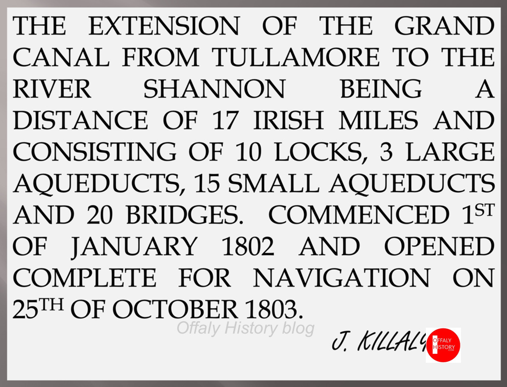 The text from an inscribed stone on the north chamber wall of the 36th lock downstream of Shannon Harbour. Note the premature date given for the opening of the waterway.