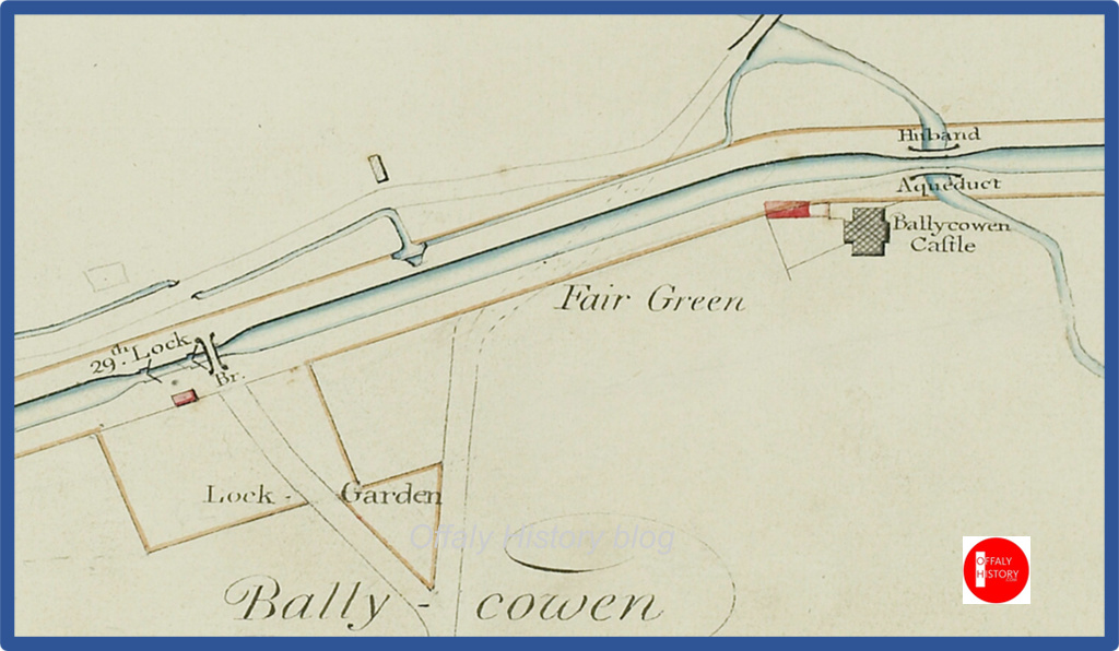 John Killaly’s map of 1807 showing many canal features at Ballycowan, a few miles west of Tullamore: The Huband Aqueduct with Ballycowan Castle nearby; the 29th or Cummins’ Lock and the mouth of the supply or feeder which brought water from the Maiden or Tullamore River into the canal just downstream of the lock. The Fair Green of Ballycowan is also shown. In February 1802 the Reverend Dean Digby, a director of the company, informed the company that a Mrs. Armstrong was willing to relinquish the right for holding fairs at Ballycowan and to sell the lands there for the sum of £60. (Courtesy of Waterways Ireland)