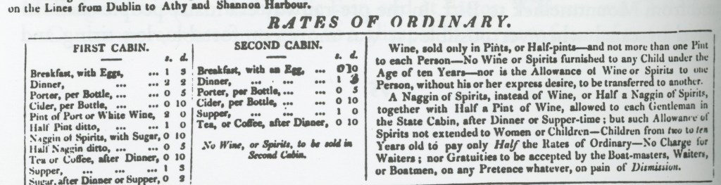 (14.Bill of Fare in 1826 .Image source Travel and Transport in Ireland, By Kevin B. Nowlan, 1973). No more than one pint of wine to each person at 2s a bottle, about 13 EURO today.