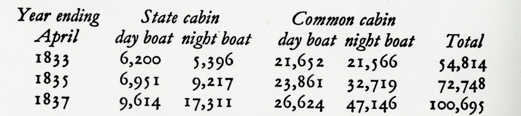 There was a steady increase in passengers traveling by boat after 1834, but it was show that the increase was largely accounted for by the passenger night boats which were kept on after the introduction of the newer fly boats[4].