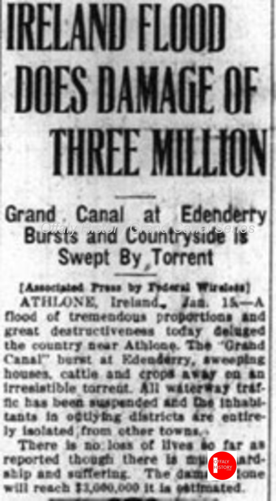 However, the local economy of Edenderry could be severely hampered by damage to the canal system. In January 1916, for example, the canal burst its banks for the first time since 1855. On 11 January 1916 almost all of the inhabitants of Edenderry were alarmed by the sound of the canal breach. It caused consternation in the town with flooding widespread, crops damaged and animals carried away on farms.