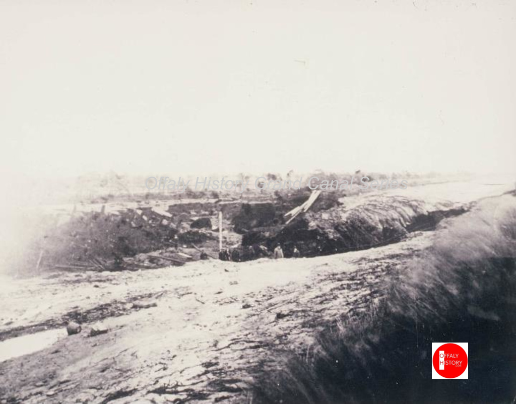 However, the breach had more far-reaching consequences, affecting businesses as far away as Limerick who relied on the route to transport their wares to Dublin. Almost immediately stop gates were erected on the Tullamore side of the town to prevent further flooding. Bog and earth were moved as the breach measured 112 yards long. Greatly affected, Daniel Alesbury and his workers helped in the erection of a dam on the Tullamore side of the town in an effort to stop the breach. Indeed, Alesbury later recalled how he was travelling from Philipstown (Daingean) at the time and was unable to proceed with goods to his furniture factory which then employed close to 500 people. During this effort, three men O’Rourke, Dempsey and Bermingham endeavouring to prevent the flow of water were swept away and narrowly survived with their lives.