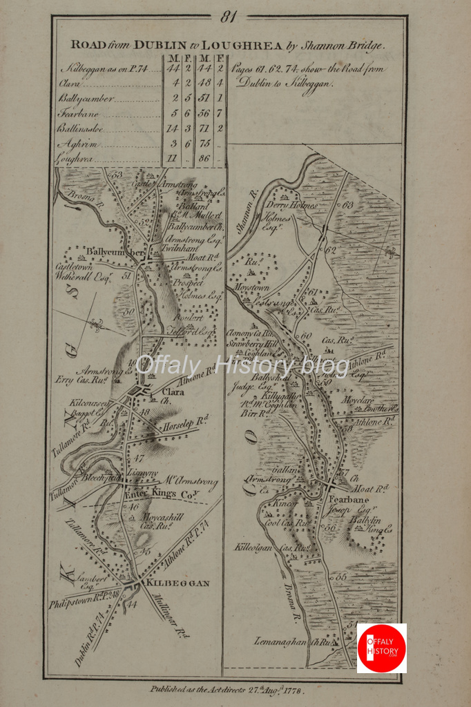 The village of Clara contains about 200 well built houses, a large flour mill, a good bleach yard, and a buck house at a convenient distance, all which is the happy effect of the industrious spirit of the landlord [Armstrong of Clara House] who with an ample fortune does not disdain to enter into trade, as well for the increase of his own fortune, as for the sake of affording a comfortable livelihood to his tenants. Six years ago there was but one poor house in this village, and that a sorry inn: He has now brought together in this neighbourhood as many linen weavers as keep 600 looms at work. The yarn is bought up chiefly in Connaught, the ashes, and other heavy articles for bleaching, come from Dublin by land carriage, which (if the proposed navigation was finished) would be brought by water to Ballycumber on the Brosna River, on which this village situated. There is also a large hat manufactory established here, for the use of the army. The arable ground is much reduced in this part of late: they buy most of the wheat for their mills at Athlone, fourteen miles distant, and that town is also the market for their flour. The poor in this part of the kingdom are all employed; there are no beggars to be seen in this county, but at Philipstown.