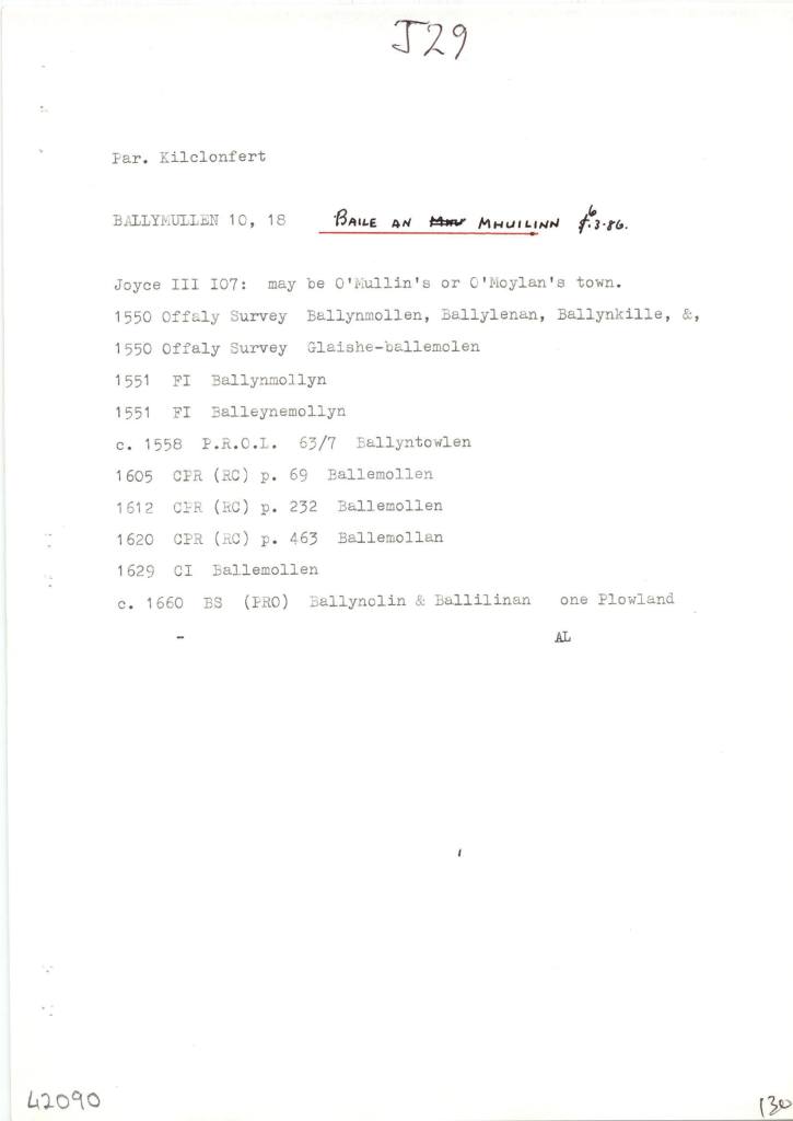 First Townland is Ballymullen: in Civil Parish of Kilclonfert, in the Barony of Lower Philipstown. The Irish name for Ballymullen is Baile an Mhuilinn.