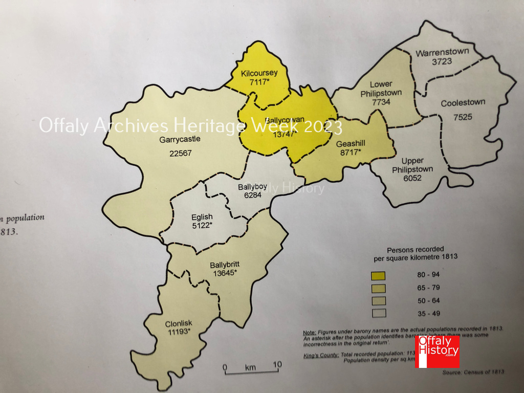 Clonbullock is a village between Edenderry and Rathangan, where is a new church, the houses small and very mean, there were two or three good dwellings here, burnt in the late rebellion [1798]: this was the only part of this country, where it actually broke out, and it is situate on the borders of Kildare county. In this barony the cottiers’ habitations are poor; the fuel is turf, which is plenty and cheap, though considerably increased in price since the Grand Canal has branched here, which skirts this and Warrenstown barony, for some distance. The food of the peasantry are potatoes and a good proportion of oat-meal, and they generally make their breakfast on stirabout; potatoes average eight shillings per barrel, of twenty-four stone; oat-meal ten to twelve shillings per cwt.; cottiers wages has been raised from five pence in winter, and six pence in summer, to eight pence and nine pence, and this hard season to one shilling per day: they pay forty shillings for a very good cabin and acre of garden, and thirty shillings for the grass of a cow: they have the advantage of rearing pigs and poultry, and every man, who has a cow, may keep a calf, free, on the pasture of his employer. The only distillery in the barony is at Edenderry; beer considerably increased in demand, but very bad. Several roads are in good repair, and others, with the bridges, are very bad; the idle effects of the rebellion still obvious. . . No schools nor charitable institutions in the barony, but at Edenderry, where the Rector of the parish is obliged to pay forty shillings annually to the master of a grammar school, which is a very mean establishment.