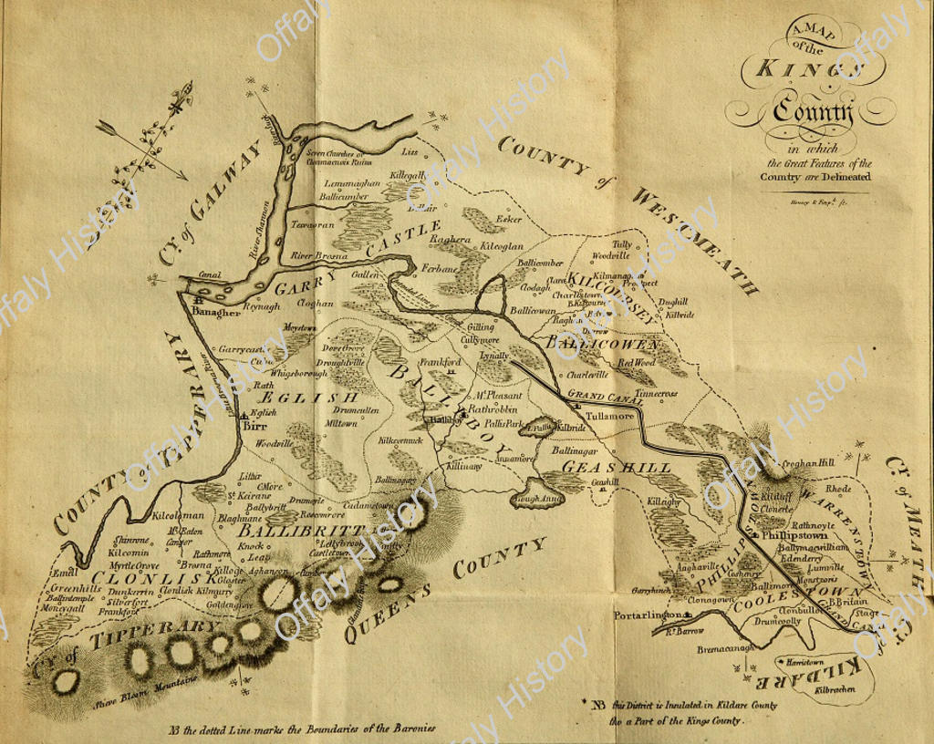 This country is very thickly inhabited; Philipstown [until 1835] which is the county town, and the only one in the barony, has hitherto sent two members to parliament; it has till lately been in a wretched state, and was rapidly fallen to ruin: now there is but little to recommend it. This town was originally part of the Molesworth estate, and, through family connections, is now divided into three properties; the most considerable part of it is enjoyed by the Right Hon. Mr. Ponsonby. The new leases now given are encouraging, and several new houses are erecting [probably those in Molesworth Street and close to the canal]. The Grand canal passes at the northern end of the town, and, before this navigation, was complete to Tullamore, it was of very material service to this town, but now of inconsiderable advantage. A new county gaol is also erecting at the rere of the barracks, which are extensive, and command the town: it is almost entirely surrounded with bog. consequently fuel must be cheap and abundant; and provisions are in plenty, yet no manufacture of any kind is carried on. It had formerly a garrison, and the ruins of a lofty castle are situate on the brink of the river. This town is thirty-eight [Irish] miles distant from Dublin.