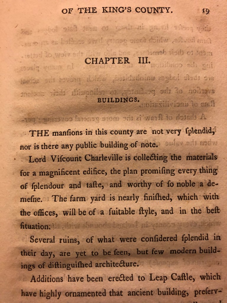 systematically penurious in repairing these roads, which are in very indifferent order, and must in the winter season be in a very wretched state. There are no mines found here, nor is there any river of note, or navigation but the Grand canal. . . Education is in a low state, nothing better than the poor-schools for peasants children. There is no nursery for sale in this barony, nor manufacture; timber is had from Dublin by the canal, none being here for sale of any kind, but what is had from Killeigh woods. The women being rather industriously inclined, and well trained to spinning worsted, which they are obliged to send to market without the barony, argues much for the success of a woollen factory, if attempted here, for which there is every natural advantage; and, from the many grift-mills which appear, a good site could not be wanted. ‘Tis surprising, on this account, there are no bolting-mills in a country so prolific in corn, very little inferior to the best corn county in Ireland. There is here considerable quantity of moor [bog] which could be reclaimed at a small expence: they have excellent falls, and limestone is very abundant and convenient. English language generally spoken, and the Irish tongue evidently decreasing. . . . Thomas Magan, Esq. resides at his beautiful seat at Clonerle, [sic] which he rents from Mr. Doolan Medlicott; but this gentleman has a very considerable estate in the county of Westmeath. This demesne contains about 200 acres, which are elegantly enclosed and planted; the farm cultivated after the best improved methods, and here are the greatest variety of well-chosen implements of husbandry. This beautiful seat altogether highly delights the eye, and richly ornaments the surrounding country; it is situate two miles from Philipstown. The dead flat and level of this barony is agreeably relieved by Croghan Hill, which stands in majestic pre-eminence, and in this country forms a remarkable feature, beautifully clothed with verdure to its summit, from whence it commands a most extensive prospect; a large tract of it was formerly enclosed as demesne land for Lord Tullamore’s ancestry, whose estate it is; and at the foot of the hill are the ruins of Croghan church, which was a chapel of ease for that family [demolished about 80 years ago]. Its pasture is of a purgative quality, and the small breed of sheep, when sent thither, grow to a large size, and throw out considerable fleeces. Mr. [Arthur] Young, in his agricultural tour through this kingdom, speaks of Croghan Hill as producing twelve pounds to the fleece; .. The hill has been celebrated by Spencer in his Fairy Queen; on its summit is an ancient burial-place, and its boundaries divide this county and that of Westmeath.