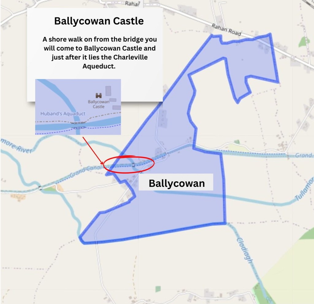 After a short travel down along the line, follow the bend of the Canal, and you will come along to the Charleville Aqueduct, named after local Lord Charleville, whose castle lies just south of the Canal[3].