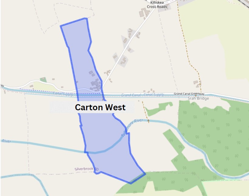 Carton West is in the Electoral Division of Silverbrook, in Civil Parish of Kilbride, in the Barony of Ballycowan, in the County of Offaly The Irish name for Carton West is An Cartrún Thiar meaning the West Carton (land Measure). This is an old measure of land.