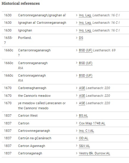 Place name records from the first Ordnance Survey of 1838 and the logaim.ie historical records of the name.