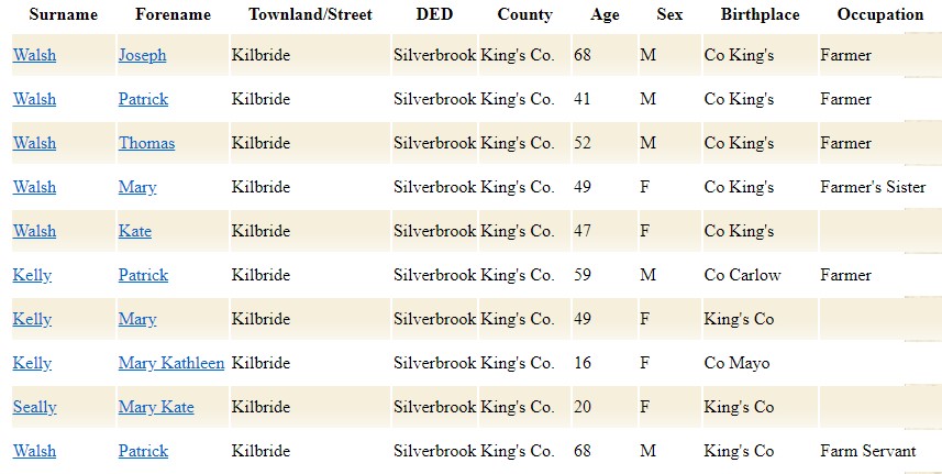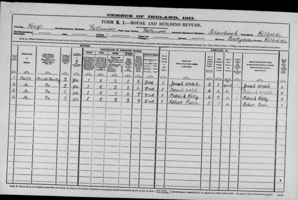 In 1911 Kilbride had a small record of houses in the area, during this period the household returns and ancillary, shows us that there was 4 buildings all of Private Dwelling, with 17 inhabited, with classes of houses between 3rd and 2nd. Here are some of the families that occupied these buildings during this time: