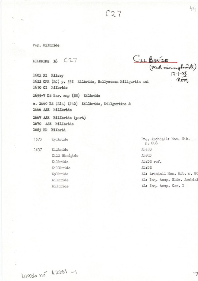 This parish is locally called Magh Lena (Moylena), which preserved the name of a plain of ancient celebrity, the site of a famous struggle between Conn of the Hundred Battles and Mogh Nuadhat. It got the name of Cill Bhrighde (Kilbride) from an old church of that name, the ruins of which still stand in Kilbride td. The ruins, however, are not so early as St. Bridget’s time, but probably occupy the site of a medieval church dedicated to St. Brigid.