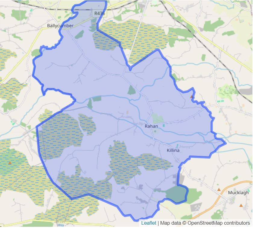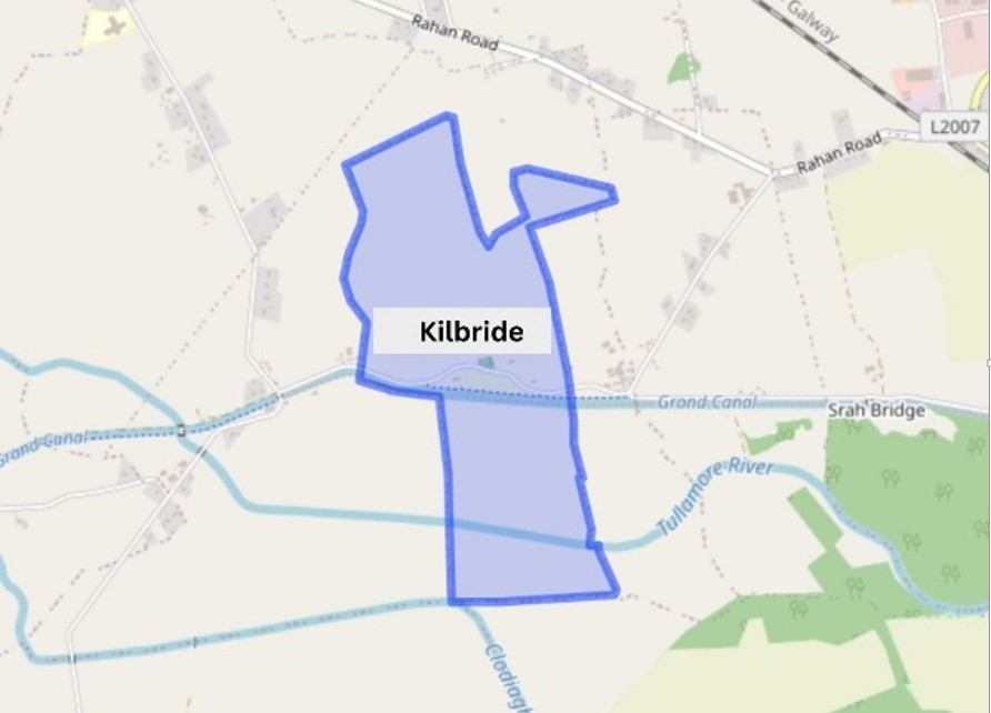 On the Grand Canal, ½ mile west of Srah Bridge, and bordering the parish of Lynally. Contains 82a. 2r. 32p. Is all arable and pasture, but the south part is subject to floods. (From the name books to accompany the mapping of 1838).